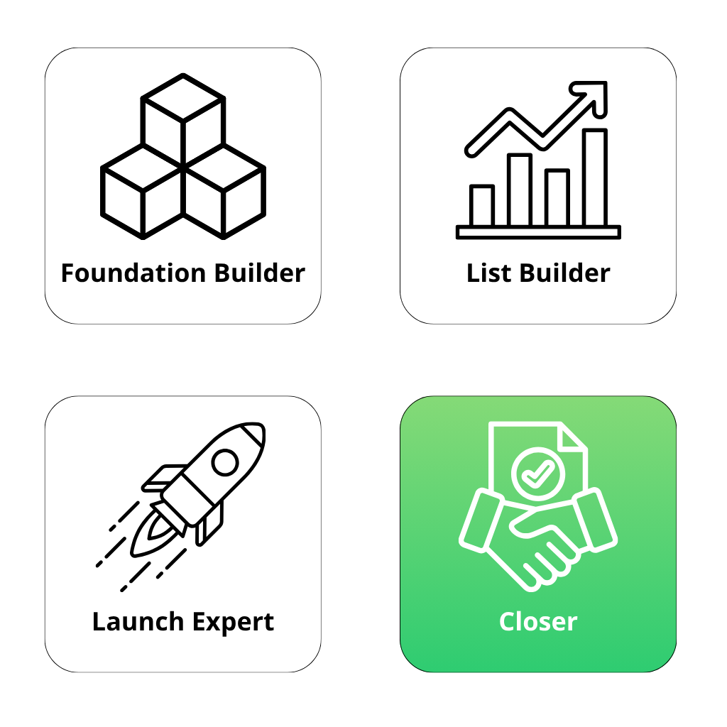 You are an instinctive sales-oriented marketer who excels at bridging connections between your offer and your audience. Your ability to understand what makes people buy and facilitate conversions is exceptional. You’ve also started building some automation, which means you’re ahead of most Closers who stay stuck in manual mode forever. You’re making good money from a relatively small list, which proves your conversion skills are strong.
